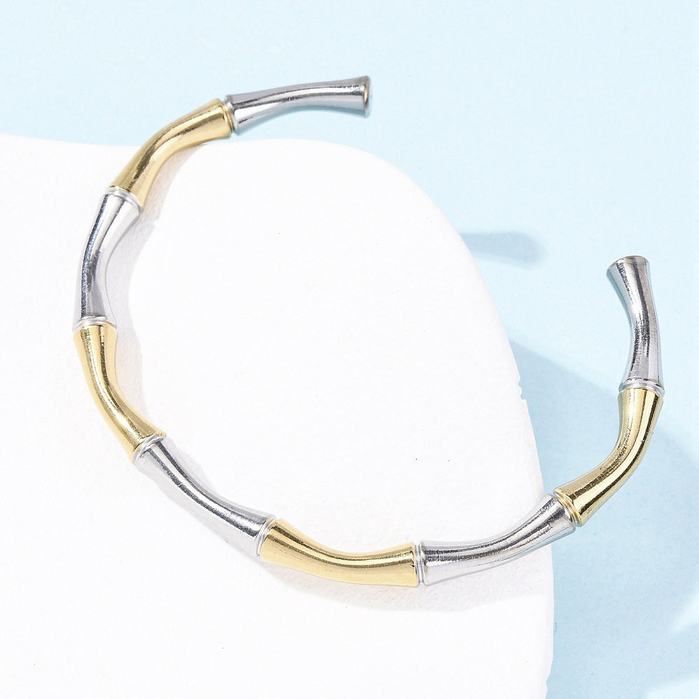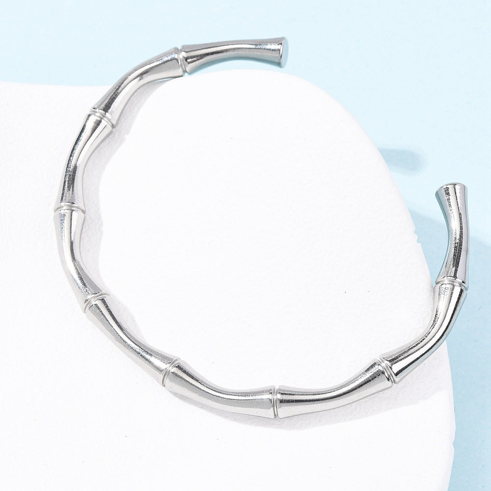Σχεδιασμένο με μια άκαμπτη αλλά άνετη ανοιχτή δομή, αυτό το βραχιόλι-μανσέτα γλιστράει εύκολα διατηρώντας το σχήμα του. Τα τμήματα σε στυλ μπαμπού προσθέτουν διακριτική υφή και ρυθμό, δίνοντας στο κομμάτι μια εκλεπτυσμένη νότα που δίνει μια αίσθηση σκόπιμης προσποίησης χωρίς να είναι θορυβώδης. Καθαρές γραμμές, αξιόπιστη παρουσία και μηδενική προσπάθεια που απαιτείται.