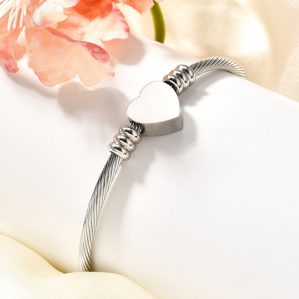 Σχεδιασμένο με ευέλικτη ανοιχτή δομή, αυτό το βραχιόλι εφαρμόζει εύκολα διατηρώντας παράλληλα μια ασφαλή και άνετη εφαρμογή. Το απαλό λουράκι σε σχήμα καλωδίου προσθέτει διακριτική υφή, ενώ η διακοσμητική καρδιά προσδίδει ένα εκλεπτυσμένο εστιακό σημείο χωρίς να υπονοεί συναισθηματικότητα. Φοριέται άψογα μόνο του ή σε συνδυασμό με άλλα βραχιόλια για μια συγκροτημένη, στιβαρή εμφάνιση.