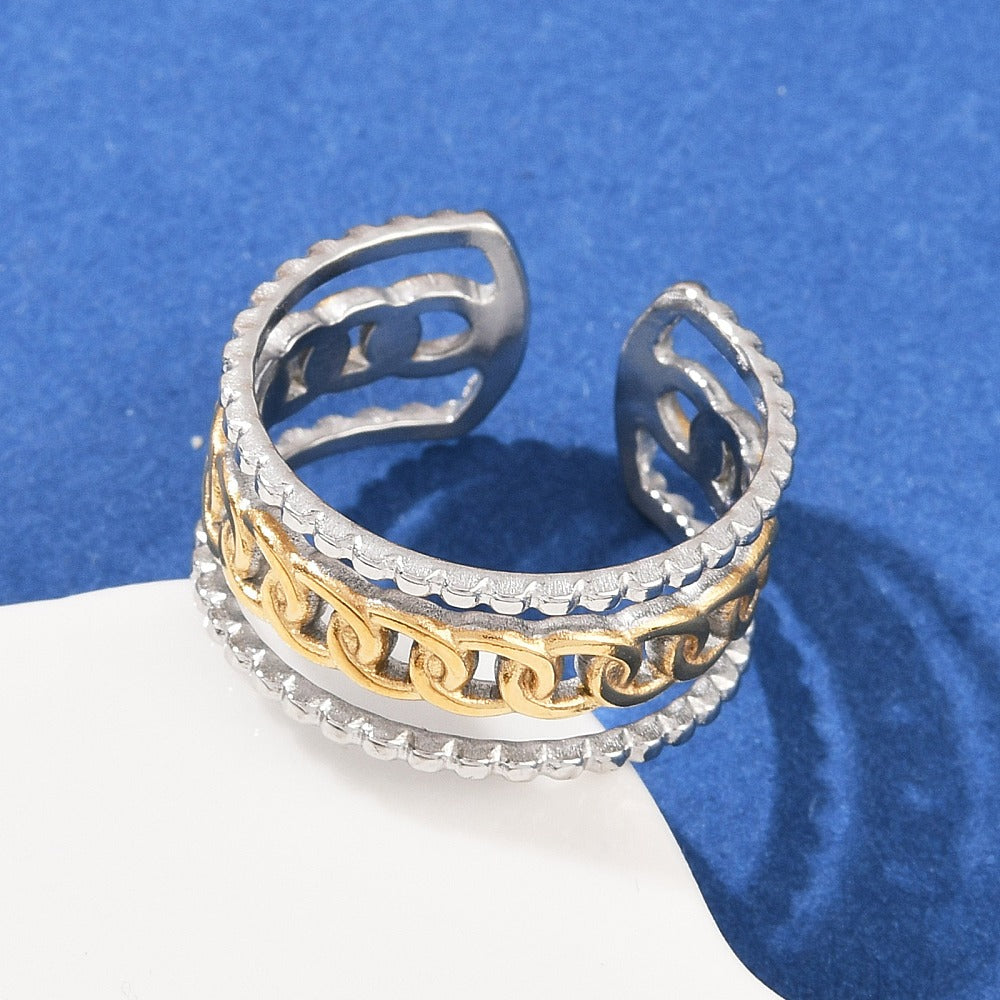 Σχεδιασμένο με μια πιο φαρδιά, πολυεπίπεδη δομή, αυτό το δαχτυλίδι περιχειρίδας συνδυάζει αλληλοσυνδεόμενα οβάλ στοιχεία με φινιρίσματα σε αντίθεση για πρόσθετο βάθος και υφή. Ο ανοιχτός σχεδιασμός επιτρέπει διακριτική ρύθμιση διατηρώντας παράλληλα το σχήμα του, καθιστώντας το ένα εντυπωσιακό κομμάτι που ταιριάζει καλύτερα όταν φοριέται μόνο του ή σε συνδυασμό με πιο απλά λουράκια. Δομημένο, μοντέρνο και σκόπιμα τολμηρό.